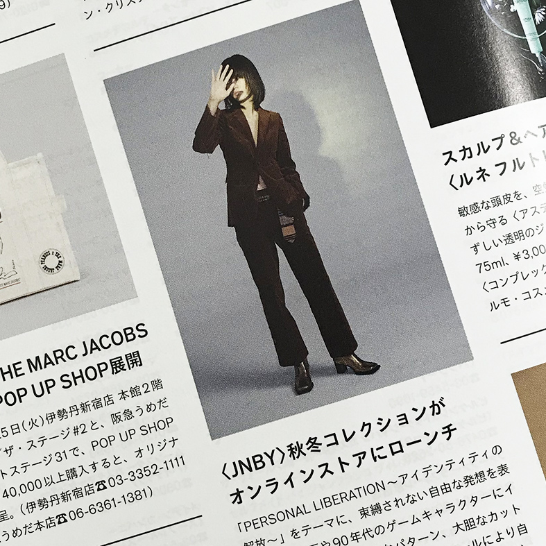 2020-08-12 Facebook で共有するにはクリックしてください (新しいウィンドウで開きます)クリックして Twitter で共有 (新しいウィンドウで開きます) 2020-08-12 Facebook で共有するにはクリックしてください (新しいウィンドウで開きます)クリックして Twitter で共有 (新しいウィンドウで開きます) JNBYのF/W2020コレクションが紹介されました。 掲載はp154 GINZA INFORMATION JNBYのF/W2020コレクションが紹介されました。 テーマは“PERSONA LIBERATION~アイデンティティの解放~” レトロクラシックなミニマムなジャケットとパンツのセットアップ。 新作コレクションはJNBY公式オンラインサイトでチェックしてください。 http://www.jnby.jp/ (2020,08,12)